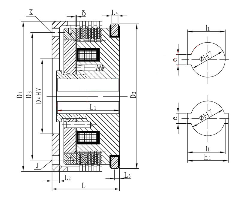 該系列離合器屬于磁通不經(jīng)過(guò)摩擦片組的結(jié)構(gòu)形式,短電后的殘余力矩小,動(dòng)作時(shí)間快。特別適用于對(duì)動(dòng)作時(shí)間有要求的場(chǎng)合使用。在使用過(guò)程中摩擦片磨損到一定程度,出現(xiàn)力矩下降時(shí),需將工作氣隙進(jìn)行調(diào)整。