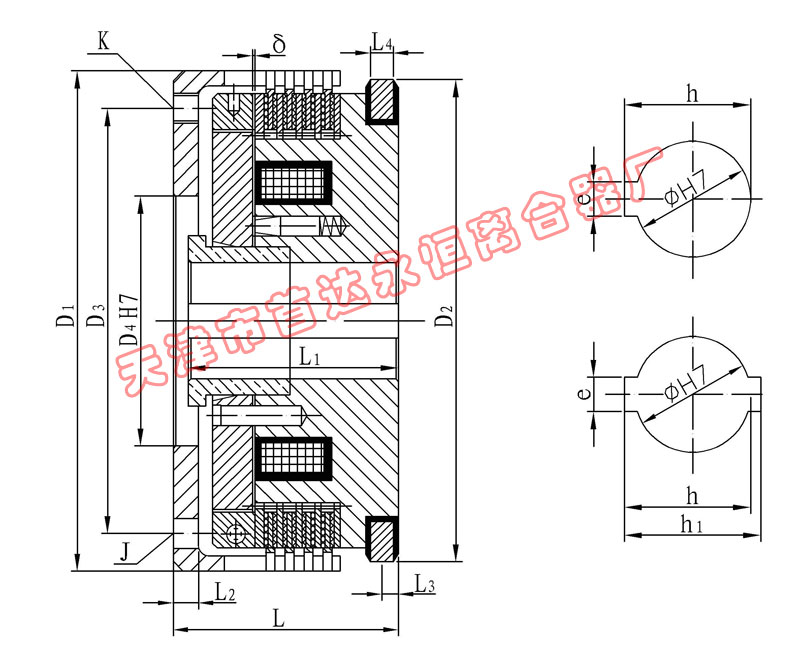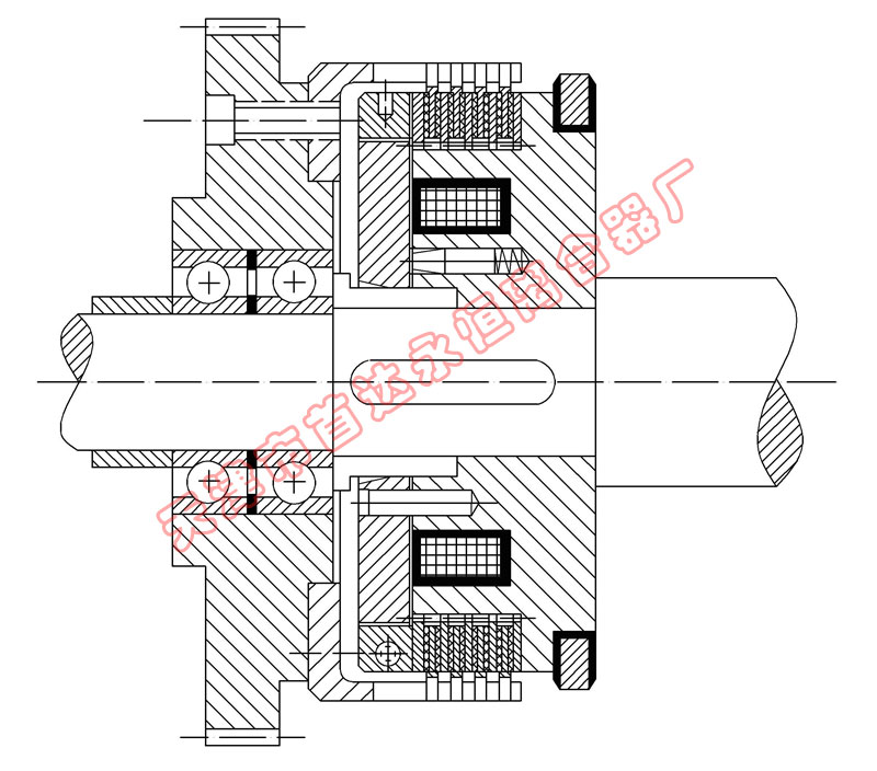 該系列離合器屬于磁通不經(jīng)過摩擦片組的結(jié)構(gòu)形式,短電后的殘余力矩小,動(dòng)作時(shí)間快。特別適用于對(duì)動(dòng)作時(shí)間有要求的場(chǎng)合使用。在使用過程中摩擦片磨損到一定程度,出現(xiàn)力矩下降時(shí),需將工作氣隙進(jìn)行調(diào)整。